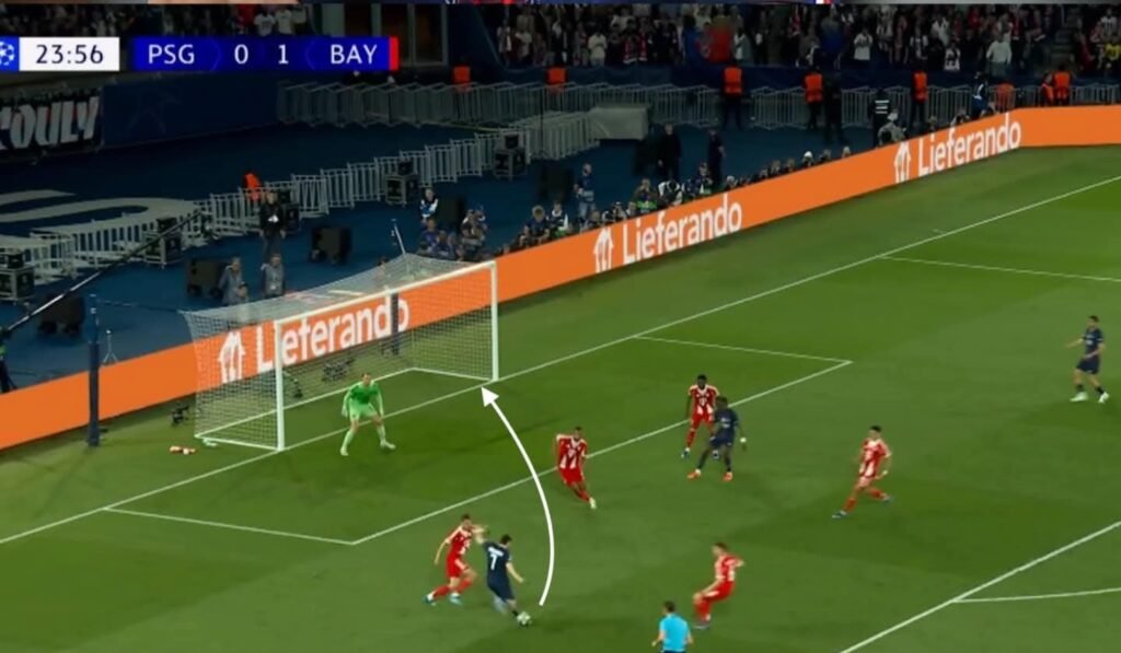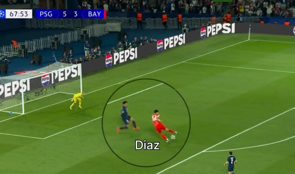 الحاجة الاولي ان لويس دياز اللي كان واقف علي الخط و بيراقب حكيمي دخل للعمق عشان يعترض التمريره و ترك حكيمي ، و التانيه هي ان لايمار انجذب خلف دوي و ترك المساحه خلفه !