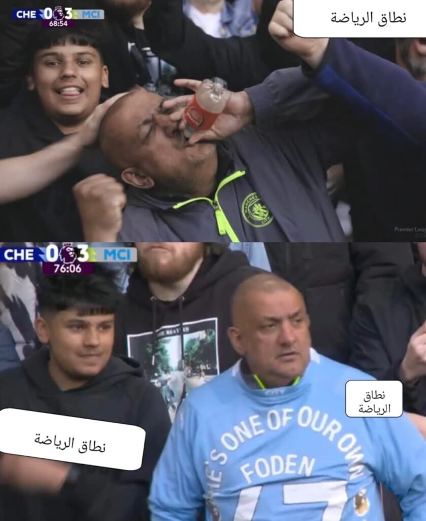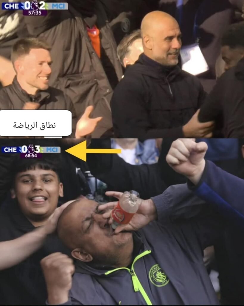 اللي حصل بالظبط ان دوكو سجل الهدف التالت لمانشيستر سيتي و خلص المباراة عشان يحتفل المشجع اللي قدامك ده و هو بيشرب من ازازه عليها شعار ارسنال !